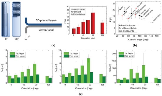 Efforts were directed towards modifying the fill angles to examine the surface roughness of the first and second printed layers, which few researchers have explored thus far with textile fabrics [,]. Figure 3a shows how fill orientations are derived and their effect on adhesion forces when PLA is additively manufactured on cotton fabric. The results indicated no significant changes in the mechanical properties of this kind of composite, although the surface roughness depends on the fill angle. Additionally, it was found that the more hydrophilic the fabric, the greater the adhesion force with the PLA filament and vice versa (Figure 3b). Regarding the contact angle, the authors noted that the adhesion forces seem to saturate below a contact angle of approximately 60°–80°. In contrast, for increasing contact angles, the adhesion forces decrease steadily [], demonstrating the importance of considering the effects of fabric pretreatment, as presented in Figure 3c.