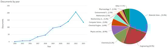 Additionally, three-dimensional printing technology has constantly improved and evolved substantially over the last three decades, giving rise to the beginnings of 4D printing. The first study on 4D printing polymers was published in 2014 [], according to the search performed in SCOPUS, and it has been growing exponentially in recent years, as shown in Figure 4.