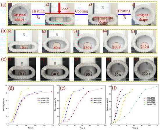 4D-printed circular braided tube shape memory cycle []: (a) Shape memory cycle of 4D printed circular braided tube, (b) shape recovery of the specimen A30L3T70, (c) shape recovery of specimen CA30L3T90, (d) shape recovery ratio vs. time curves of specimens L3T70 with three braiding angles of 20°, 30° and 40°, (e) shape recovery ratio vs. time curves of specimens A40L3 at three shape recovery temperatures, and (f) shape recovery ratio vs. time curves of specimens A30T90 with two braiding layers, three braiding layers and five braiding layers and the specimen CA30L3T90. Adapted from [] under the terms of Elsevier and Copyright Clearance Center, 2023.