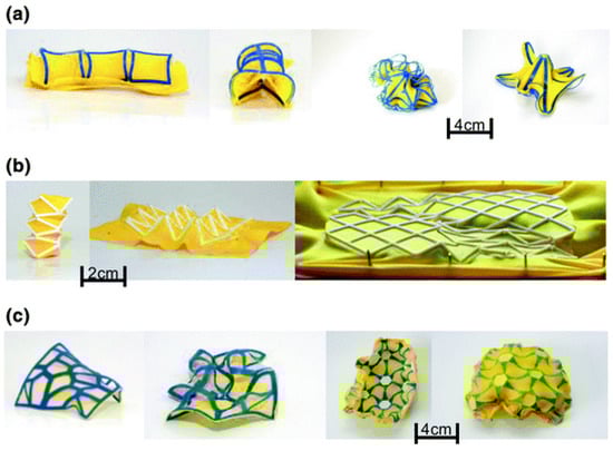 Schmelzeisen et al. [] developed microstructures printed on previously stretched hyperelastic textiles, which act as energy storage, to measure the change in shape from temperature, as shown in Figure 7. The functional principle of 4D printing polymer textiles is based on the interaction of the properties of an elastically stretched textile surface and shaped beam reinforcements []. The textile surface is elastically prestressed and, therefore, absorbs potential energy. Defined areas of the textile are then printed. When the pretension is released, a restorative force is generated in the textile, which is opposed by the elastic stiffness of the reinforcement.