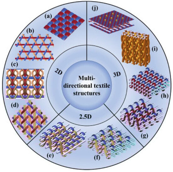 Multidirectional textiles are classified based on the preform structures’ dimension []. 2D textile structures: (a) plain woven fabric, (b) triaxial woven fabric, (c) knitting fabric inset with straight yarns, and (d) 2D triaxial braid. 2.5D textile structures: layer-to-layer angle-interlock woven fabric (e) without, and (f) with insetting straight yarns. 3D textile structures: (g) 3D through-the- thickness angle-interlock woven fabric, (h) 3D orthogonal woven fabric, (i) 3D braided structure and (j) 3D stitched laminated preform. 2.5D, two-and-a-half- dimensional. Reproduced from [], with permission from Elsevier and Copyright Clearance Center, 2023.