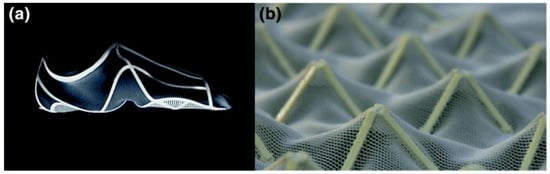 Some 4D printing industrial applications: (a) adaptive shoes and (b) sound-absorbing panels []. Reproduced from [], with permission from Springer Nature and Copyright Clearance Center, 2023.