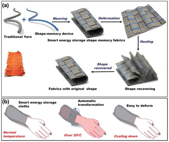 - Ehrmann, G.; Ehrmann, A. Shape memory textiles—Technological background and possible applications. Commun. Dev. Assem. Text. Prod. 2021, 2, 162–172. [Google Scholar] [CrossRef]