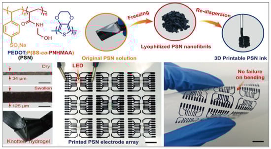 - Yu, J.; Tian, F.; Wang, W.; Wan, R.; Cao, J.; Chen, C.; Zhao, D.; Liu, J.; Zhong, J.; Wang, F.; et al. Design of Highly Conductive, Intrinsically Stretchable, and 3D Printable PEDOT:PSS Hydrogels via PSS-Chain Engineering for Bioelectronics. Chem. Mater. 2023, 35, 5936–5944. [Google Scholar] [CrossRef]