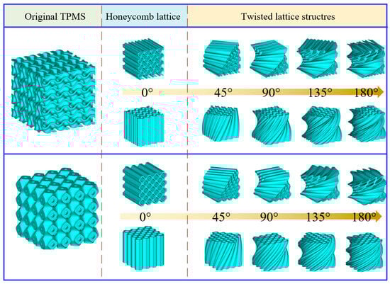 where A is the rotation angle of the entire lattice structure, and zmax and zmin represent the maximum and minimum z coordinate of the structure, respectively. (xo, yo, zo) and (x, y, z) are the original and the updated coordinates. By combining Equations (4) and (5), a honeycomb surface with self-twisted characteristics can be derived. The honeycomb-based lattice structures can be subsequently obtained by thickening the surface.
