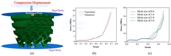 A numerical study was carried out by using the commercial finite element (FE) software Abaqus (version 6.14-4) to understand how the twisting characteristic influences the mechanical properties of the structure in different directions. The finite element model is shown in Figure 3a. The improved quadratic tetrahedral element (C3D10M) was used in the model, and the model was sandwiched between two rigid plates to establish automatic surface contact (friction coefficient is 0.2). To ensure the convergence and reliability of the FE model, a mesh sensitivity analysis was conducted by repeatedly reducing the mesh size and obtaining the strain–stress curve until changes in the results were negligible. Using this method, the value of 0.6 is determined for the mesh size and the number of meshes for lattice structures ranges from about 0.67 to 1.11 million. During the process of compression, the upper steel plate is fixed, and the lower steel plate moves uniformly from the bottom to the top. The specific parameters used were based on previous research [37,40]. Figure 3b shows the comparison of the experimental and simulation results of the G45y0 lattice structure. It can be seen from the diagram that the two curves fit closely, indicating that the simulation results are quite reliable.