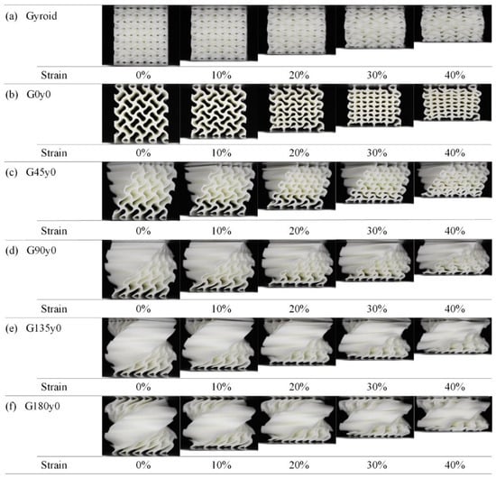Figure 6 shows the deformation of lattice structures in the first group with strains ranging from 0 to 40% during the quasi-static compression experiments. With regard to the gyroid structure, it can be seen from Figure 6a that in the process of compression, the deformation is very uniform, there is no stress concentration in some areas, and there is no obvious fracture, which is consistent with the stress–strain curve. Figure 6b shows the G0y0 structure. During the compression process of G0y0, the deformation of the structure as a whole is relatively uniform, and the fracture mainly occurs in the corner; the deformation of the upper right corner is different, and the fracture occurs outwardly, resulting in an obvious stress concentration. This may be attributed to differences in the element structure of the lower right corner and lower left corner. Figure 6c–f show that the deformation of the deformed Gy0 structure is more uniform during the compression process, and the plastic deformation of the structure is buffered by the twisting behavior. This phenomenon is also reflected in the stress–strain curve, where those of the twisting structures appear smoother.