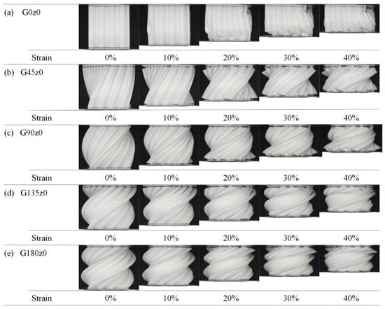 Figure 8 shows the deformation of the structures in the second group with strains ranging from 0 to 40% during the quasi-static compression experiments. The obvious instability of G0z0 during compression is mainly manifested as tilting to one side, which leads to an obvious stress concentration on the left side and the upper right side, and finally leads to excessive bending and fracture. It can be seen from Figure 8b–e that the self-twisting behavior buffers the plastic deformation of the structure. With the increase in the twisting angle, the instability disappears, and the bearing capacity becomes more stable. This is consistent with the change in the stress–strain curves.