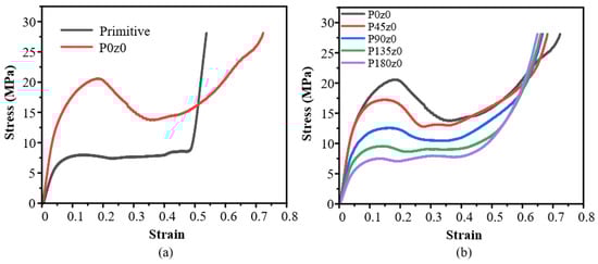 When the z coordinate in the mathematical expression of the primitive structure is set to a fixed value, the stress–strain curve of Pz0 is obtained by quasi-static compression along the z-axis, as shown in Figure 11. It can be seen from Figure 11a that the Young’s modulus of P0z0 is larger than that of the primitive structure in the elastic stage, and the stress peak value is higher. When the strain is about 0.17, plastic failure occurs and the stress decreases. When the strain is about 0.35, the stress drop stops and enters the densification stage only after a very short platform period. Figure 11b shows the stress and strain of Pz0 structures with different angles. It can be seen that with the increase in the twisting angle, the Young’s modulus of the structure in the elastic stage decreases gradually, the peak stress decreases gradually, the plastic collapse gradually weakens, and the platform period becomes longer. The increase in the angle reduces the degree of plastic collapse of the structure in the compression process.