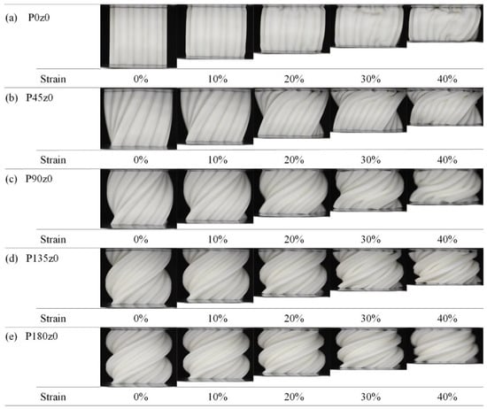 Figure 12 shows the deformation of the fourth group with strains ranging from 0 to 40% during the quasi-static compression experiments. As can be seen from Figure 12a, the deformation of P0z0 starts from the upper and lower sides. With the increase in the strain, the structure gradually expands outward, and the deformation of the structure begins to tilt to the right. The deformation of the rightmost element is particularly obvious, showing instability similar to that observed in G0z0. It can be seen from Figure 12b–f that after being self-twisted, the structure instability disappears, the degree of plastic collapse weakens, and the overall stability improves, which is consistent with the stress–strain curve in Figure 12. Simultaneously, its performance is similar to that observed in the Gz0 group.