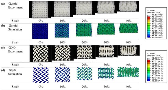 To better understand the deformation mechanism of lattice structures with different twisting angles under quasi-static compression, a finite element simulation analysis for each group of structures was conducted. Images under different strains are captured and compared with those obtained from the experimental process. Taking Gy0 as an example, Figure 13 shows the comparison between experimental results and simulation results of the gyroid and G0y0 structures in the strain range of 0–40%. From Figure 13a,b, it can be seen that the deformation of the gyroid structure in the simulation is consistent with that in the experiment, the overall stress is more uniform, and there is no obvious stress concentration. It can be seen from Figure 13c,d that the deformation of G0y0 in the simulation is consistent with that in the experiment. Moreover, it can be seen from the simulation results that the stress in the area where the elements are connected is larger. This may be attributed to bending phenomena in the connected areas, likely causing bending deformation and more concentrated stress.