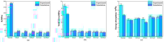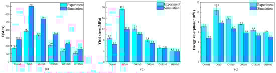 Figure 15c shows the energy absorption of different structures in the experiment and simulation. The amount of energy absorption is the area around the stress–strain curve and the strain axis, which reflects the compressive capacity of the structure. As can be seen from the figure, the experimental results of the gyroid, G0y0, G90y0, and G135y0 structures are larger than the simulation results, among which the experimental results of the gyroid structure are the highest compared to the simulation results, which is about 47.9%. The experimental results of G45y0 and G180y0 are smaller than the simulation results, but the difference is not very large. According to the experimental results, the gyroid structure absorbs the most energy and G0y0 absorbs the least energy. From 0° to 180°, the energy absorption shows a gradual upward trend as a whole. According to the simulation results, the gyroid structure absorbs the most energy and G90y0 absorbs the least energy. From 0° to 180°, the energy absorption initially increases, then decreases, followed by an increase. In short, for the Gy0 structure, the gradual increase in the angle has little effect on the Young’s modulus and yield stress in the elastic stage of the structure, but the amount of energy absorption increases gradually with the increase in the twisting angle.