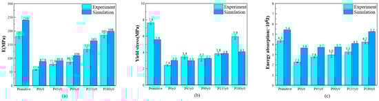 Comparison of mechanical properties between experimental tests and numerical of primitive, P0y0, and other self-twisted lattice structures: (a) stiffness; (b) yield stress; and (c) energy absorption.