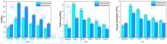 It can be seen from the Figure 17c that both the experimental and simulation results show that the primitive structure absorbs the most energy and P0y0 absorbs the least energy. The energy absorbed by the structure increases from 0° to 180°. In a word, for the Py0 structure, the Young’s modulus, yield stress, and energy absorption of the structure increase with the increase in the twisting angle.