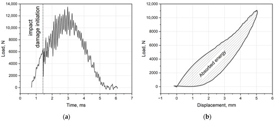 Figure 1. Results obtained after impact test: (a) “Load–time” diagram with impact damage initiation. (b) “Load–displacement” diagram and the area for calculation of absorbed energy.
