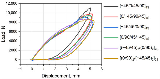 The typical smoothed load–displacement curves for each laminate layup can be obtained and are plotted in Figure 3. The diagram shows loading and unloading of a specimen; thus, the area delineated by the curve characterizes absorbed energy, which is spent mostly on damage nucleation and propagation. Of course, some minor portion of energy is dissipated on internal and contact friction or heating. The key parameters of the loading and absorbed energy (as curve delineated area) are presented in Table 2. In should be noted that a higher maximum load does not mean higher absorbed energy.