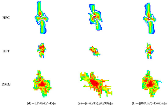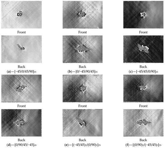 Due to the visual analysis, some general results might be drawn. The damage to the front surface was smaller than that at the back surface. The layup had a minor effect on the damage shape at the front, while at the back, the top layer delaminated more extensively and thus affected the shape of damage. The shape of damage at the back surface was elongated in the horizontal direction for layups with a 0°-orientate direction of fiber on the outer layer (Figure 4b,d,f). On the contrary, for layups with 90° at outer layers, the damage at the back surface was elongated in a diagonal direction: from upper left to bottom right.