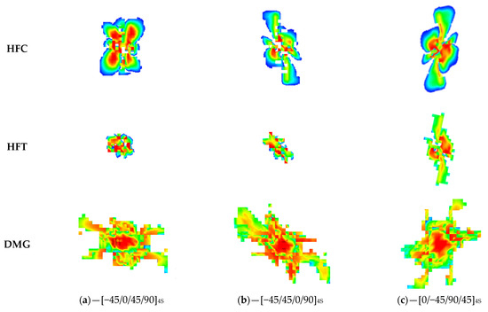 Figure 5. Damage in various layups according to different failure criteria. HFC—Hashin failure criterion for fiber compression, HFT—Hashin failure criterion for fiber tension, DMG—overall damage index for cohesive surfaces (denoted in ABAQUS as CSDMG). Blue-green-red color scale depicts damage index from 0.5 to 1.