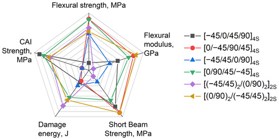To answer the question of what layup is better, five of the most valuable parameters were chosen—flexural strength, flexural modulus, short-beam strength, damage energy, and compression strength after impact. The higher the parameter value, the higher performance of the layup. In summary, the best layups in relation to the most of properties are the [(0/90)2/(−45/45)2]2S and [0/90/45/−45]4S layups.