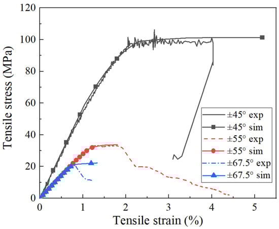 The built constitutive model was conducted on ZFRP laminates. A quarter finite element model built in [], which is simply and reveals minimal mesh dependency, was employed. The comparison results were shown in Figure 2. The deviation of the predicted UTS was less than 3%. The simulated failure modes, either matrix tensile failure or matrix shear failure, were also in good agreement with the experimental ones. These verified the applicability of the constructed constitutive model to ZFRPs.