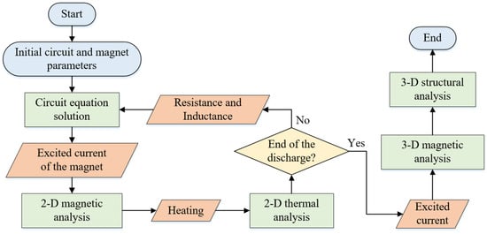The simulation strategy for pulsed magnets was illustrated in Figure 3. Initially, the coupling field of the electrical circuit, magnetic field, and thermal field were solved using a sequential coupling method with a two-dimensional (2D) axisymmetric formulation. The circuit current was firstly solved; then, the calculated current was used to excite the magnet. The induced voltage of the magnet was refreshed by the magnetic penetration method []. Next, the Joule heat from the magnetic analysis was loaded on the thermal analysis module and refreshed the coil resistance accordingly [].