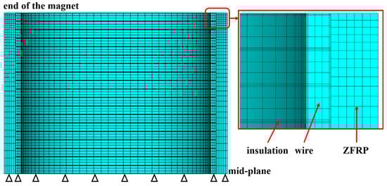 The 2D model present in [] was employed for the electromagnetic and thermal analysis. A 3D semi-model was used for the structural analysis of the inner magnet to reduce the computing time and enhance convergence, while a 1/2 3D semi-model was used for the outer magnet. The difference is due to the discrepancy ratio of the inside diameter to the height of magnets. The boundary limits in the finite-element modeling included the axial displacement being fixed on the axial cross-section (mid-plane) and the symmetric boundary (Uhoop = 0) being applied on the hoop cross-section (for the outer magnet). Additionally, since the edges of the magnet are fixed by flanges, the radial and hoop displacement of the end wires were constrained, while the wires could deform freely axially.