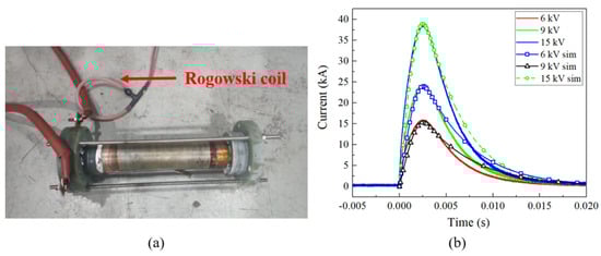 Electromagnetic model verification: (a) Experimental configuration; (b) Discharging current.