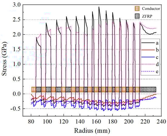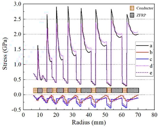 Analyses of the inner magnet were performed first and incorporated the small deformation formula. Figure 6 presents the stress distribution on the mid-plane at the designed peak magnetic field. ZFRPs in particular exhibited a maximum hoop stress of 2.93 GPa. The maximum axial compression stress in the wire reached 440 MPa, while that in ZFRPs reached 150 MPa. The maximum radial compression stress reached 280 MPa on the interfaces between the wires and ZFRPs, gradually decreasing towards zero in the radial direction. Furthermore, the absence of progressive failure consideration resulted in an approximate 18% increase in the axial compression stress on ZFRPs and a decrease in the hoop stress by 540 MPa. These changes are attributed to the significant variations of the anisotropy of ZFRPs, since the hoop stress increases as the anisotropy of the reinforcements [].