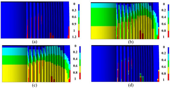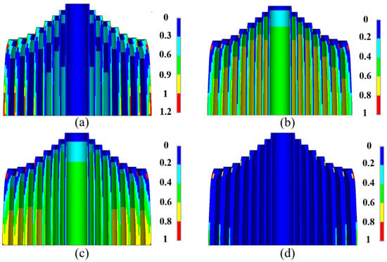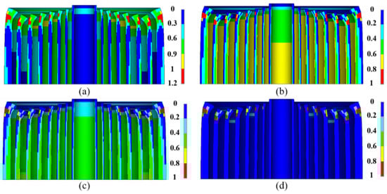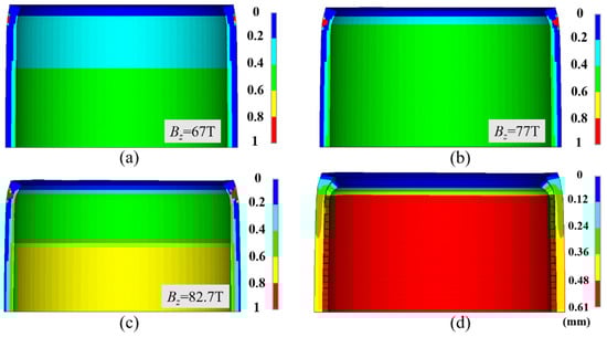 Subsequently, a dynamic structural analysis incorporating the large deformations formula was performed. The rise-time of the pulse was 3.54 ms, and each conductor layer and its corresponding reinforcement (abbreviate this entirety as CR) was analyzed separately. The analysis revealed that the first CR did not undergo any structural damage, while local buckling was observed in the 2nd to 7th CR. Once macro-damages occurred, the failure zone evolved much more rapidly than the statics (Figure 9a–c), ultimately leading to the complete destruction of the entire end-structure (Figure 9d). The end reinforcement could no longer constrain the wires.