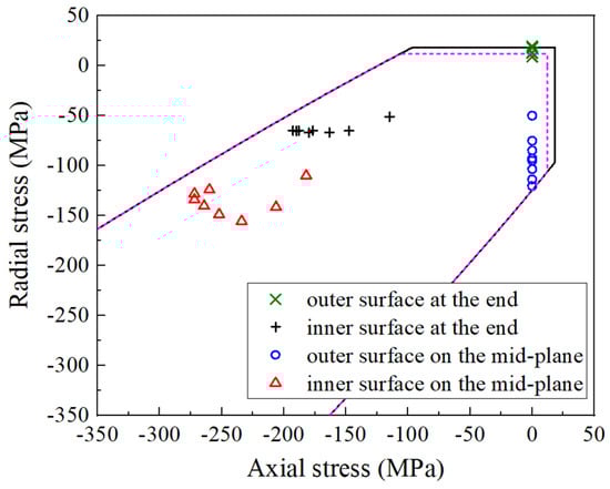 Axial vs. radial stress on the inner and outer surfaces of inner magnet reinforcements. The solid line indicates the macroscopic failure envelope, while the dashed line indicates the micro-failure envelop.