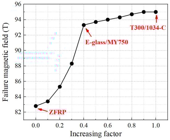 The transverse mechanical properties, denoted as , , , and , were artificially altered to discuss its impact on the magnets’ performance. Both sets of the properties were increased to the same proportion, with the properties of T300/1034-C [] serving as the target (when the increasing factor reached 1). The corresponding failure magnetic field of the 95-T prototype is shown in Figure 13. Since the Lorentz forces increased quadratically as the magnetic field grew, as depicted in Equation (16) (where J is linear to B), the failure magnetic field exhibited rapid escalation initially, followed by a deceleration in its growth once the increasing factor reached 0.4. Notably, when the increasing factor reached 0.9, the magnet remained intact. In a word, it is evident that the failure magnetic field increased with the enhancement of transverse properties. This observation underscores the importance of reinforcement materials possessing not only high longitudinal strength but also effective impregnation with epoxy to ensure robust transverse strength.
