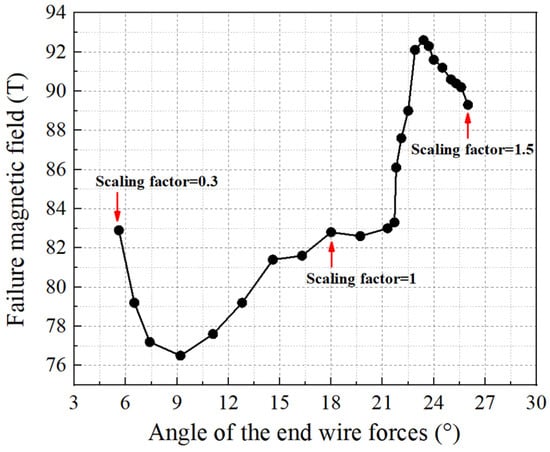 The general trend in the failure magnetic field variations can be roughly interpreted as follows: Under a moderate force angle of approximately 23°, the wires predominantly bear most of the axial forces and ZFRPs remain intact. As the axial forces increase further (with the axial force scaling factor exceeding 1.5), the wires approach their plastic limit, and ZFRPs gradually assume a greater share of the axial forces, leading to a reduction in the failure magnetic field. Conversely, when the end force angle is approximately 9°, ZFRPs take on the majority of axial forces, resulting in the lowest failure field. If the axial forces are further reduced, the failure field would increase. It should be emphasized that it is asymmetric to change the axial Lorentz forces in a physical sense; therefore, the trend of the curve in Figure 14 is also asymmetric.