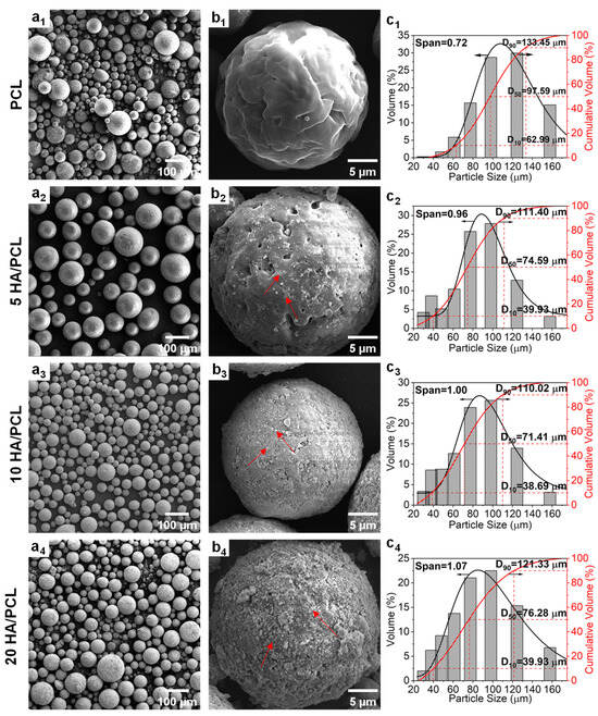 (a1–a4,b1–b4) SEM images and (c1–c4) particle size distribution curves of the PCL and HA/PCL composite powders ((b1–b4) are the high-magnification images; red arrows point to HA particles).