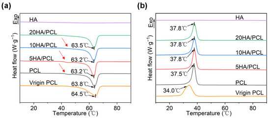 DSC curves of the virgin PCL, PCL, and HA/PCL composite powders: (a) heating and (b) cooling process at a rate of 10 °C/min.