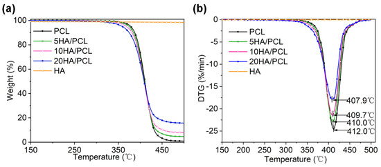 Thermal stability of the PCL and HA/PCL composite powders under air atmosphere: (a) TG and (b) DTG curves.