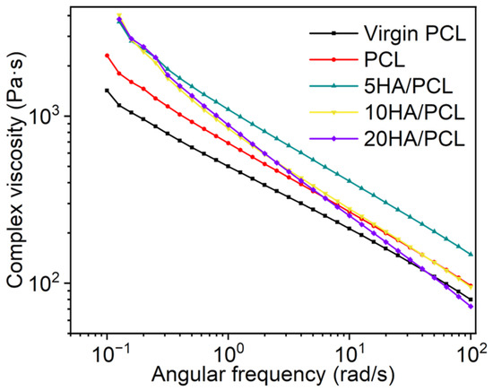 Complex viscosity curves of virgin PCL, PCL, and HA/PCL composite powders.