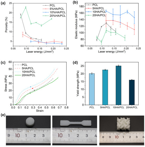 Mechanical properties of the SLS-manufactured scaffolds: (a) porosity; (b) compressive modulus; (c) typical stress–strain curves of the scaffolds at the laser energy of 0.12 J/mm3 (the points in the figure are the corresponding yield strengths); (d) yield strength at the laser energy of 0.12 J/mm3. (e) Photos of typical specimens.