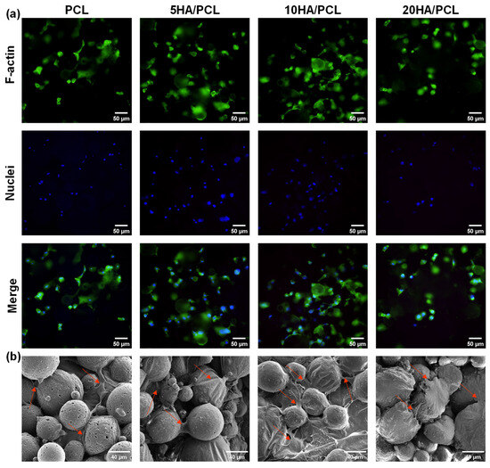 The biocompatibility of the SLS-fabricated PCL-based scaffolds was evaluated through in vitro cell culture. The adhesion of the MG-63 cells on the scaffolds after 24 h was observed using a fluorescent microscope, images from which are shown in Figure 8a. The cell nuclei were stained blue using DAPI and exhibited a distributed pattern, forming a network distribution surrounding the microspheres on the outer surface of the scaffolds. The F-actin (stained green) also displayed a similar distribution around these spherical areas, with some connections observed between them, indicating the adhesion of the cytoskeleton on the surface of the microspheres within the scaffolds. The SEM analysis further revealed the adhesion of MG-63 cells onto the surface of the microspheres and within the interstitial spaces, with concurrent extension of filopodia to neighboring microspheres (Figure 8b). These results indicated that the inherent rough top surface of the SLS-printed scaffolds provided ample microspheres and pores, which offered a substantial surface area for cell attachment, growth, and migration. Among the various scaffolds tested, the 5HA/PCL and 10HA/PCL scaffolds demonstrated enhanced cell attachment and spreading compared to pure PCL; however, a further increase in HA content resulted in a decrease in both the growth and migration of MG-63 cells.