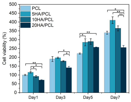Cell proliferation on the PCL and HA/PCL composite scaffolds on days 1, 3, 5, and 7 (n = 5, * indicates p < 0.05, ** indicates p < 0.01).