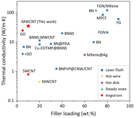 The continual increase in the thermal power density of electronic devices poses a great challenge to thermal management technology [1,2]. Polymer-based thermal management materials, with the advantages of a good electrical insulation performance, flexibility, light weight, and high strength, have attracted a lot of attention and are widely used in the thermal management field. However, the thermal conductivity (TC) of polymers is too low (~0.3 W/(m·K)) to meet the thermal conductive requirements [3,4,5]. Here are two pathways to improve it. One is to tune the aggregation state of polymer materials to provide an efficient phonon transport path to enhance TC [6,7]. Another method is to add high-thermal-conductivity fillers into the polymers. The fillers are usually mixtures of ceramic powders [8,9,10], metal powders [11,12,13], or even diamond powders [14,15]. Practically, the TC of polyethylene (PE, [–CH2–CH2–]n) fibers and films can achieve 104 W/(m·K) [16] and 62 W/(m·K) [17], respectively, which is the highest among the pure polymers because of its simple C–C bond. However, PE is not suitable for practical thermal management applications due to its low melting temperature (~120 °C), where the aging condition of most application scenarios reaches 150~180 °C. In our previous work [18], poly(vinyl alcohol) (PVA, [–CH2–CHOH–]n) with a melting temperature higher than 200 °C was introduced. The bulk TC was enhanced from ~0.3 W/(m·K) to 8.51 W/(m·K) because it preserves the carbon chain as an efficient phonon transport path and introduces only minor changes (e.g., –OH in this work) [19,20]. Furthermore, a number of low-dimensional materials were composited with PVA for a thermal conductivity investigation, including carbon nanotube (CNT) [21,22], carbon fiber [23], boron nitride (BN) [24,25,26,27,28], MXene [29], fluorographene nanosheets (FGN) [30,31], graphite oxide (GO) [32,33], and their composites [34,35,36,37]. The composite materials show high TCs ranging from 1 to more than 100 W/(m·K) at different loadings (shown in Figure 1). BN, FG, and MXene can reach high loadings for more than 70 wt.%. The FGN/MXene/PVA [34] composite with the 80 wt.% filler content achieves the highest TC of 122.5 W/(m·K). However, the high filler loading incurs aging risks such as dryout or cracking. Thereby the low-loading composites, although they may have a lower TC, are more pragmatic choices. In PVA composites with loadings of less than 50 wt.%, multi-walled CNT filler is one of the most popular TC enhancements. However, it is not as high as expected, especially when the TC of CNT theoretically reaches the range of 2000–6000 W/(m·K) [38]. It may be that the random arrangement and spontaneous clustering of CNTs make the CNT/polymer composites less thermally conductive [39,40].