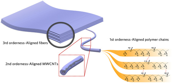 Schematic of triple-level orderness strategy for MWCNT/PVA composite fibrous film. The film is comprised of MWCNT@ PVA core-shell nanofibers. The 1st-level orderness is to align polymer chains; the 2nd-level orderness is to align the MWCNTs; and the 3rd-level orderness is to align fibers.