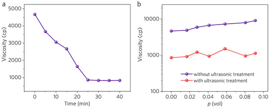 In our previous work [18], we used high-power ultrasonic pretreatment to break the hydrogen bonds and disentangle the polymer chains. The polarized Fourier transform infrared (FTIR) and the wide-angle X-ray scattering (WAXS) results verified that ultrasonic pretreatment can significantly enhance the chain-aligning efficacy of electrospinning. Thus, here, ultrasonic pretreatment was also applied to the mixture of PVA solution and MWCNTs. However, FTIR and WAXS are posterior measurements. In practice, we need a real-time indicator of the disentanglement degree while processing. Viscosity measurement was found to be an effective means for this. Figure 3a shows the viscosity change in the pure PVA solution following different ultrasonic treatment times. With the increase in treatment time from 0 min to 25 min, the viscosity of the solution decreases significantly, from 4670 cP to 858 cP, and then reaches a plateau. The distinct decrease indicates that the PVA chains are well disentangled. When the filler is added (Figure 3b), a distinct decrease still appears over a wide range of MWCNT volume fractions.