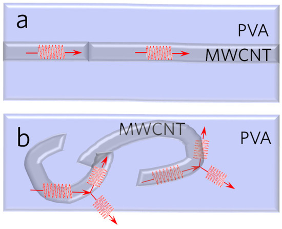 Arranging MWCNTs: The MWCNTs (Chengdu Organic Chemistry Co., Ltd., CAS, Chengdu, China) used in this work have an average diameter of 10 ± 3 nm and length of 7 ± 2 μm, ρ = 1.62 g/cm3. A water-dispersing agent for carbon nanotubes with both an aromatic ring and hydrophilic group was used to improve the dispersibility. During the dispersing process, the aromatic ring can attach to MWCNTs, and the hydrophilic group improves the dispersibility of MWCNTs in water. Then, the proper amount of modified MWCNTs was added to the PVA solution and dispersed ultrasonically for half an hour to form solutions with different MWCNT/PVA concentrations (from 0 to 12 wt%). The volume fraction was then calculated using the weight fraction and the density of MWCNT and PVA.
