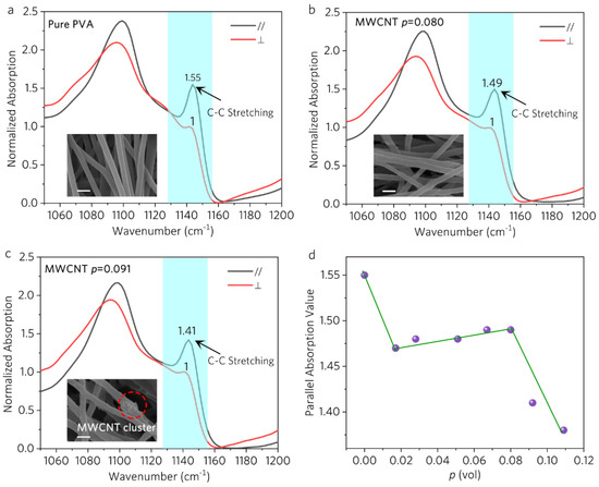 (a–c) FTIR spectra of the films with different modified MWCNT volume fractions (p) at two polarized IR configurations—parallel (//) and perpendicular (⊥). The parallel (//) configuration requires the IR polarization along the main axial direction of nanofibers. The perpendicular (⊥) configuration requires the IR polarization perpendicular to the axial direction. Insets: SEM images of the films and the scale bar is 300 nm. (d) The absorption values (1143 cm−1) as a function of volume fraction (p) at parallel (//) polarized IR configuration.