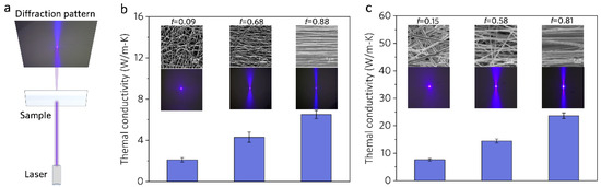 Figure 7b,c exhibit the TC of pure PVA and MWCNT/PVA (10 wt.%) nanostructured film with different f values. The highly aligned PVA nanostructured film with f = 0.88 has the highest TC (6.6 W/(m·K)), triple that of the randomly aligned nanostructured film (f = 0.09) (Figure 6b). Similar rules are observed for the composite MWCNT/PVA (p = 0.08) nanostructured film (Figure 6c). The highly aligned composite nanostructured film with f = 0.81 has a TC of 23.60 W/(m·K), almost quadruple that of the film with f = 0.15. These indicate that the TC of the film increases with the alignment degree of the fibers. Moreover, the random orientation and curvature of fibers may also lead to an increase in the phonon scattering at the fiber boundary, inducing a decrease in TC.