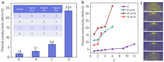 Figure 8 shows the TC of the MWCNT/PVA (p = 0.080) nanostructured film with different levels of orderness. The TC of the MWCNT/PVA nanostructured film without any orderness is 1.8 W/(m·K). Along with the introduction of orderness to each level, the TC moves higher each step. The measured TC, as a function of the hot stretching ratio (λ), is depicted in Figure 8b. The TC of the nanostructured film increases further, from 15.7 W/(m·K) (λ = 1) to 35.4 W/(m·K) (λ = 6) (10 wt%), since hot stretching can improve the alignment of polymer chains and fibers, which has been shown in our previous works [18]. As shown in the WAXS pattern (Figure 8c), the relative intensity of the dispersion ring along the stretching direction diminished, while that perpendicular one gradually became concentrated, showing that the orientation of the composite increased with the increase in draw ratio. Compared to other polymer composites reported in Figure 1, our MWCNT/PVA composite exhibits the highest TC with a low loading.