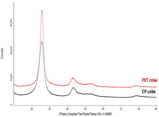 Elemental analysis (Table 2) as well as XRD (Table 3, Figure 1) and FTIR (Table 4) results showed chemical and structural similarity of both CP and PET cokes. However, the FTIR analysis revealed that the CP coke’s chemical structure is more aromatic which corresponds to its higher true density. On the other hand, some aliphatic groups are presented in PET coke, in contrast to CP coke.