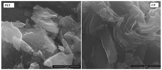 It was also found that during grinding the PET coke was broken down into rather irregular solid crumbs, while the CP coke grains disintegrated mainly along carbon planes giving flake-shaped particles (Figure 3). It can also be seen that the particle size of PET is on average 2 μm whereas flake-shaped CP particles are approximately the same size, but are interconnected. Perhaps this explains the better mechanical and electrical properties of the CP-1 composite (see Section 3.2.4 and Section 3.2.5).