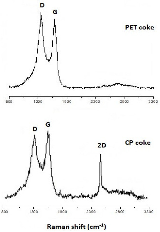 Raman spectroscopic analyses confirmed the previous findings obtained by other methods. In Raman spectra of both fillers, evident bands typical for carbon materials were observed (Figure 4). The G bands occurring at 1584 cm−1 and 1586 cm−1 for the PET and CP cokes, respectively, were attributed to the E2g of polyaromatic C-C structures and the D bands at 1355 cm−1 (PET) and 1349 cm−1 (CP) associated with disordered, sp3-hybridized carbon, were attributed to in-plane defects in graphene sheets or occurrence of heteroatoms [56]. These results showed the similarity of the structural order of PET and CP samples with the domination of less ordered structures in both cokes. However, the D-band to G-band area ratio (AD/AG) of 2.140 and 2.061 for PET and CP cokes, respectively, indicates a slightly better order in the CP structure. This is also confirmed by the presence of a sharp and narrow 2D band at ~2450 cm−1 in the spectrum of CP coke, suggesting the occurrence of graphene structures with a high degree of structural order [57,58]. This band is not visible in the spectrum of the PET sample.