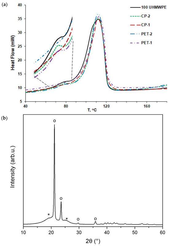 (a) Crystallization peaks of pure UHMEPE and UHMWPE-based composites filled with various grain fractions of PET and CP cokes. The insert shows the behavior of the crystallization curves in the low temperature range of 60–90 °C; (b) XRD pattern typical for the composites with coke particles < 200 µm; o—orthorhombic phase of polyethylene, *—monoclinic phase of polyethylene.
